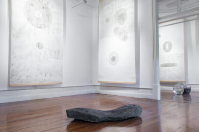 “Cosmos e átomo em sintonia, em sincronia, em puro acto amoroso. Corpo e linhas entrelaçados em longos papéis. Há depois as manchas silenciosas que esperam por nós. E as alfaias agrícolas, que revolveram a terra, a água e o vinho tinto, que saciaram a sede, as camélias, que embelezaram os dias e aquecem o coração sem pulsar.